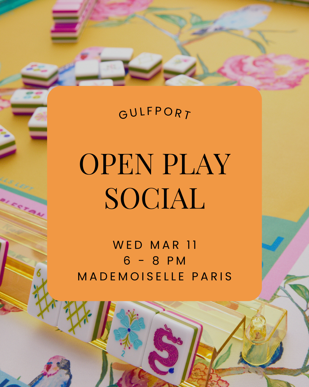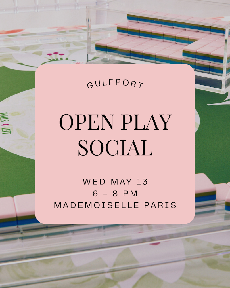 Ooh La La Mahj! is our monthly themed Mahjong soirée at Mademoiselle Paris restaurant in charming Gulfport, where we gather around the tiles, enjoy delectable French bites, and savor the simple joy of good company. Each month brings a fresh, playful theme to add a little extra sparkle.