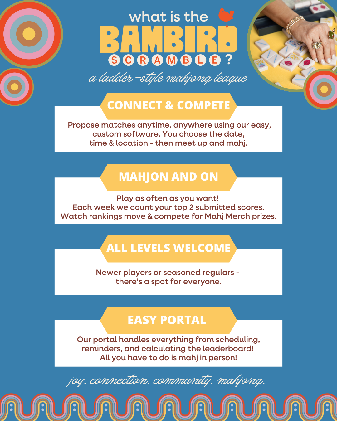 The Bambird Scramble is a community-driven Mahjong ladder league that blends smart technology with real-life play. It connects Mahj’ers online & brings them together in person to play, compete, & make new Mahj friends.